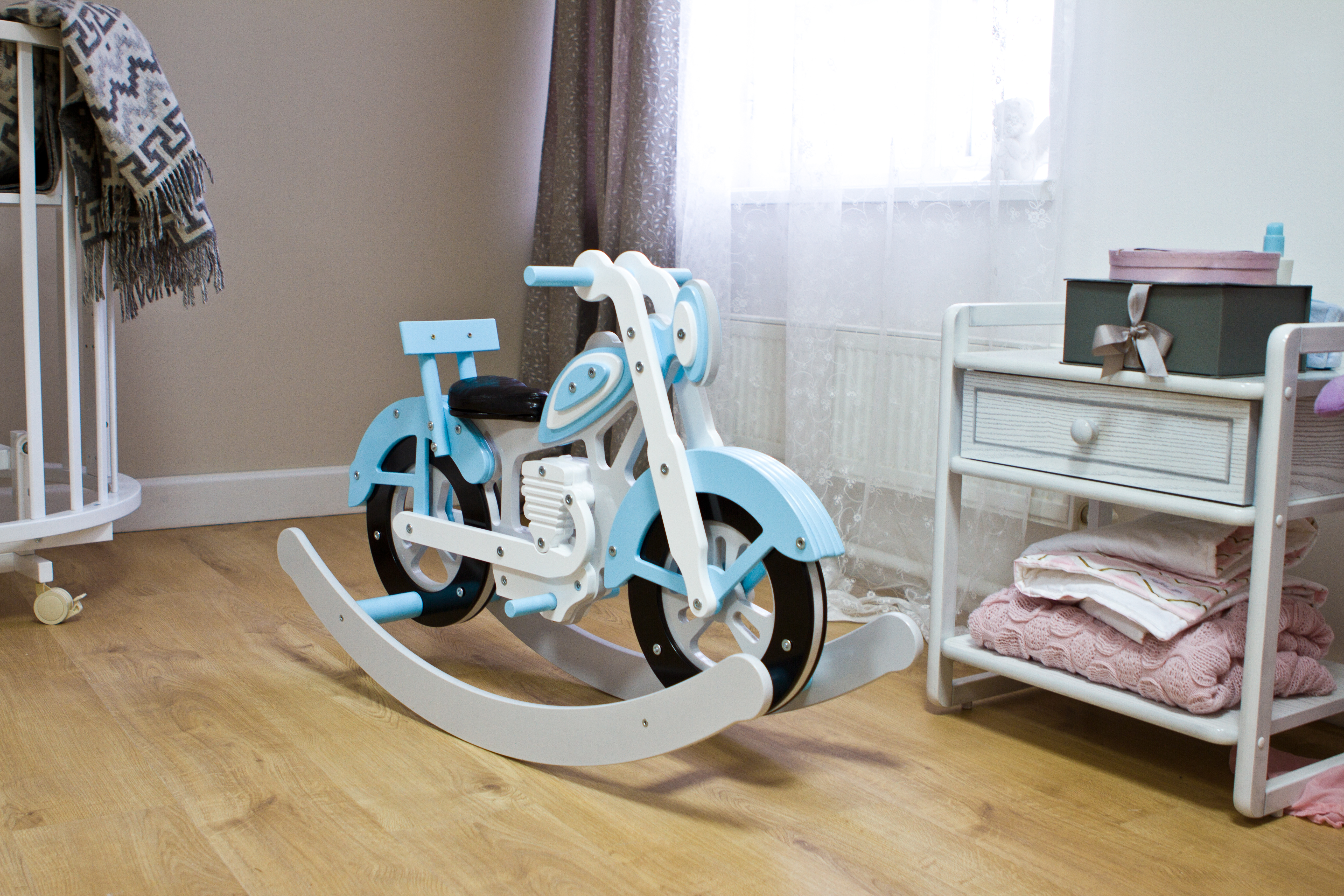 Мотоцикл-качалка изготовлена из плиты МДФ ламинированной, натуральной древесины и гнутоклееных деталей. Состоит из 2-х опор-качалок соединенных между собой поперечинами, на которые установлен мотоцикл. Мотоцикл состоит из 2-х колес, сидения с чехлом, спинки сидения, подножки и стойки на которые установлены 2-е ручки для держания ребенка во время качания.