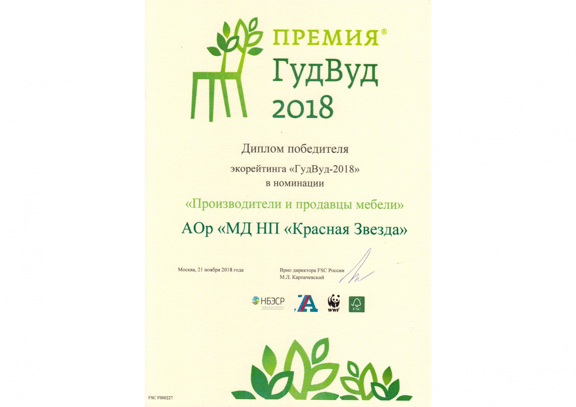 АОр «МД НП «Красная звезда» награждена Дипломом победителя премии экорейтинга «ГудВуд-2018» в номинации «Производители и продавцы мебели»